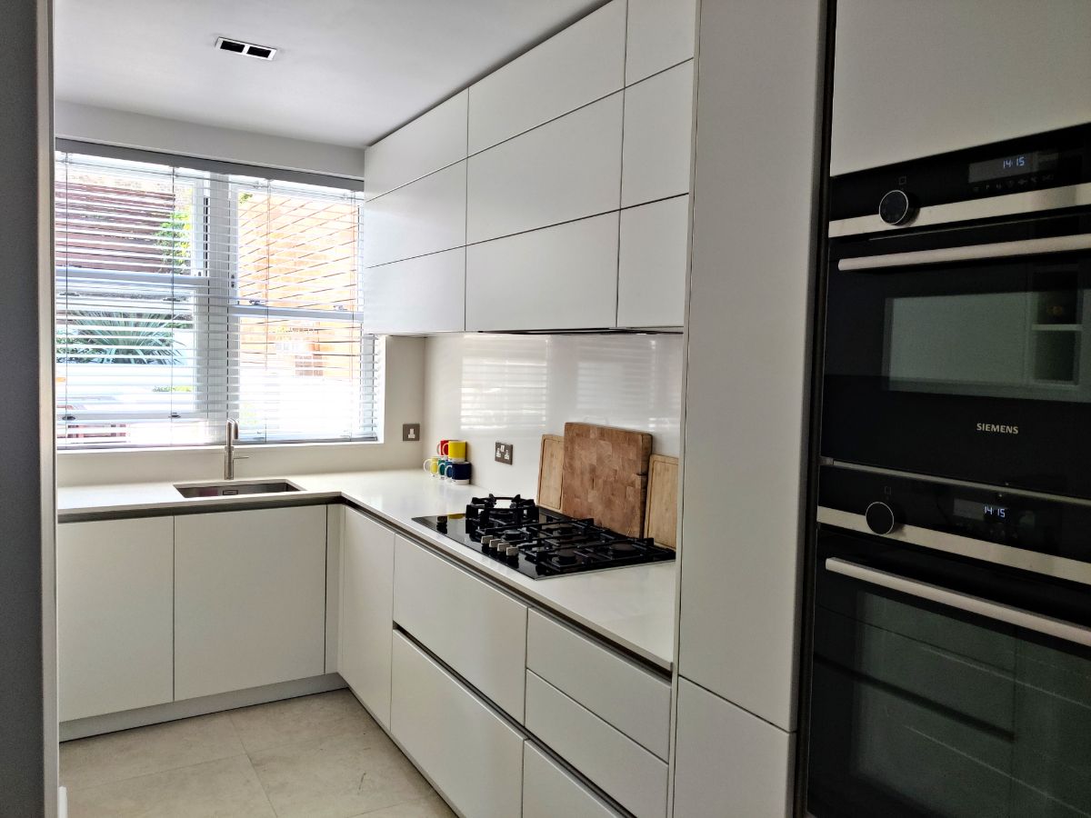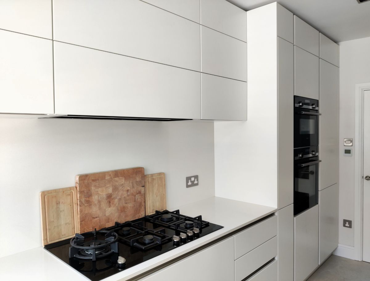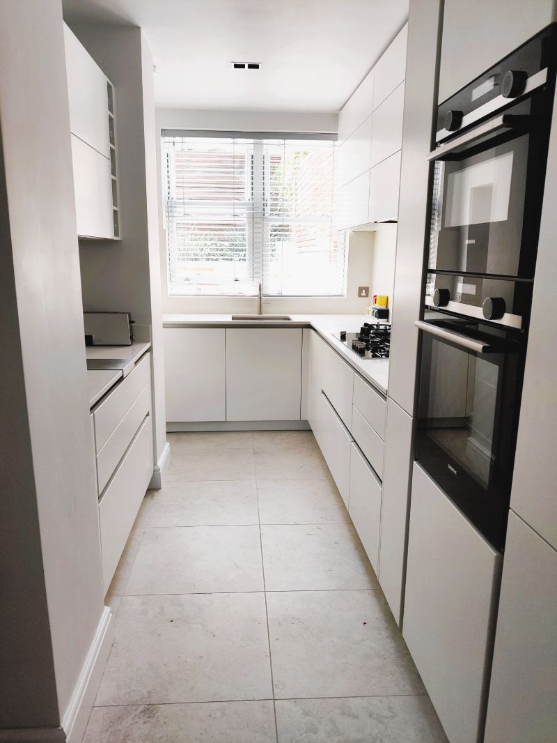 You don’t need a huge space for a German kitchen to look great. This is the Siena door from Schuller in white matt velvet lacquer with anti-finger print finish. Tip-on opening mechanisms for the wall units and Emotion LED lighting throughout. Thankyou very much to our customers Claire and Alan for sharing the photos.