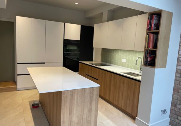 The door colour is Crystal white in matt finish from our Schuller C range. Contrasting with the white are Onyx black handle rails and LED lit roller shutter unit with power points also in Onyx black. Natural elements added with the base unit doors, island and integrated book shelving in Aurora oak effect. The worktops are 20 mm thick Nuevo quartz. Thank you very much to our customers Clare and Jason.