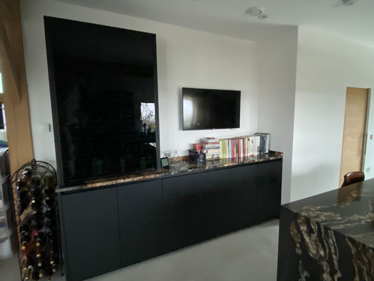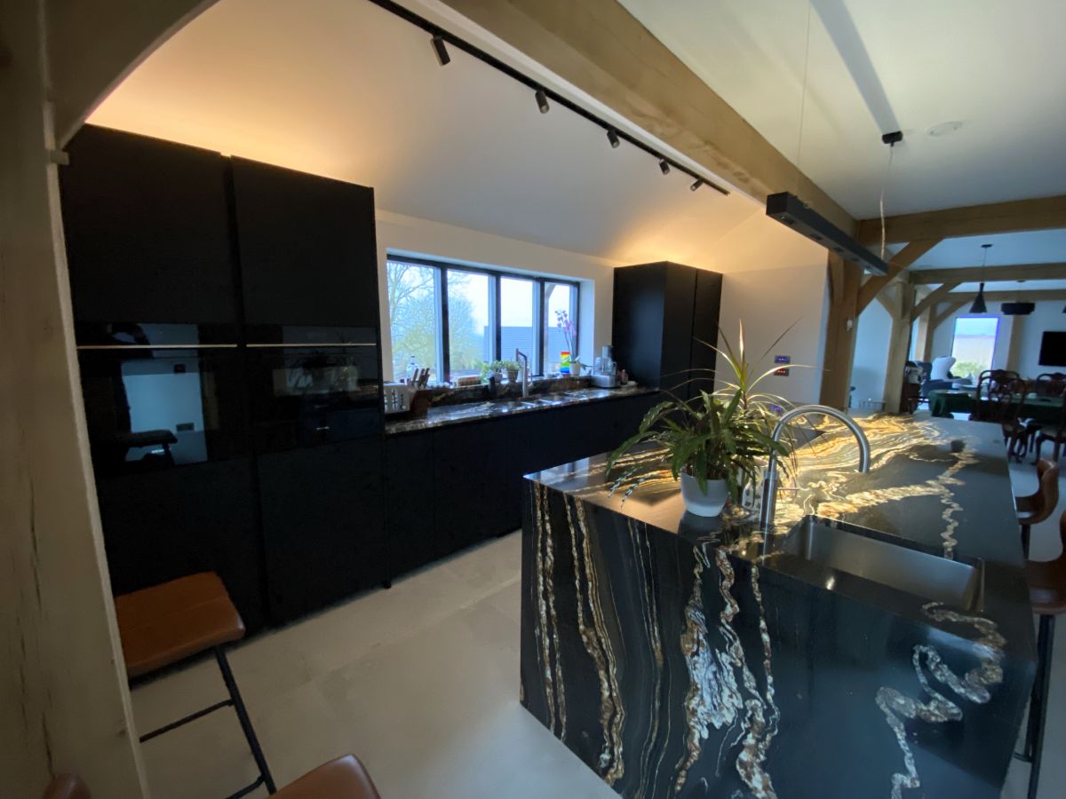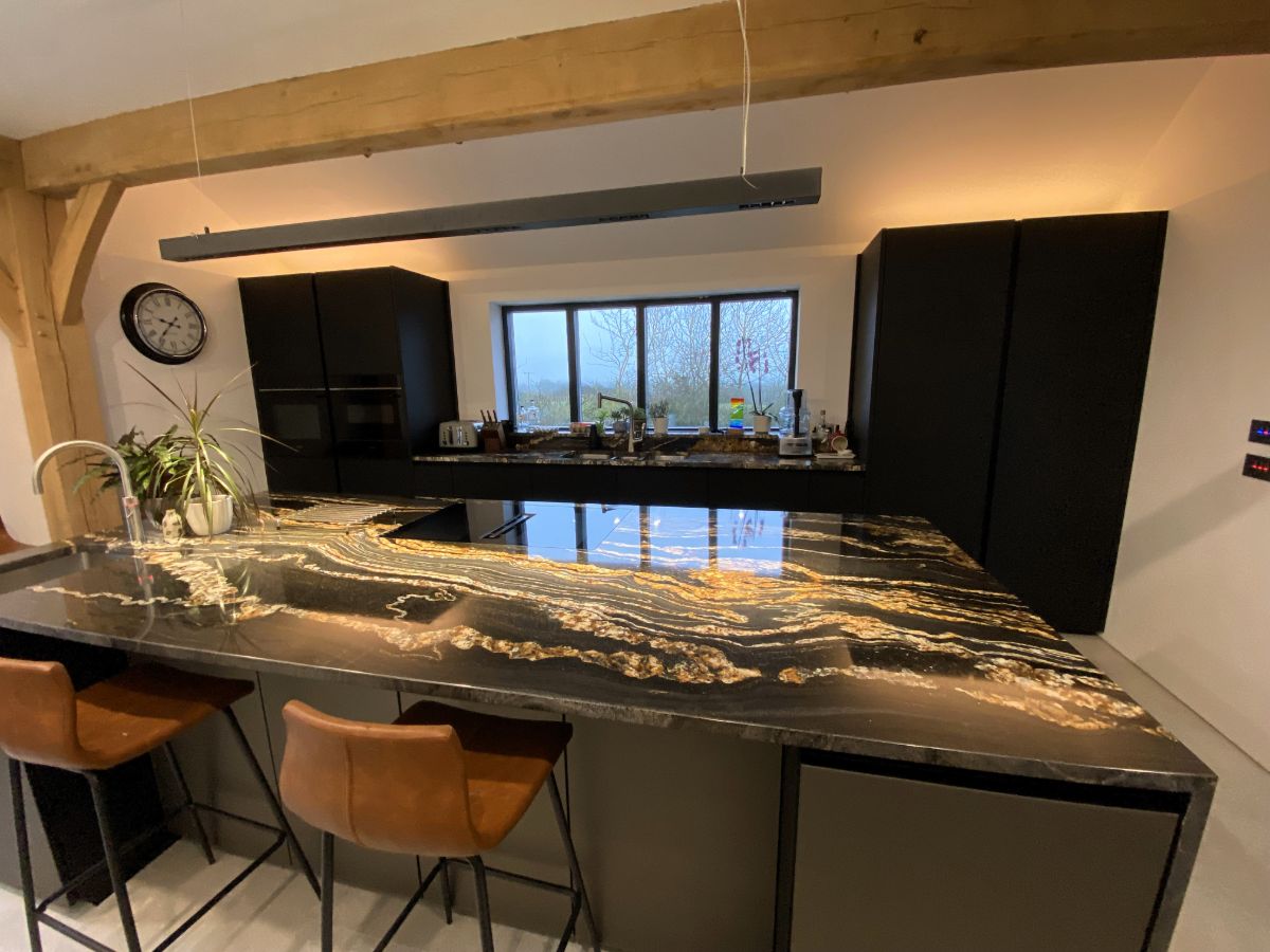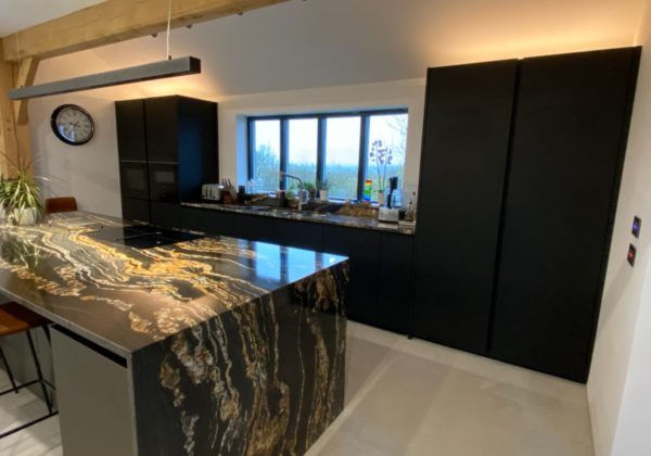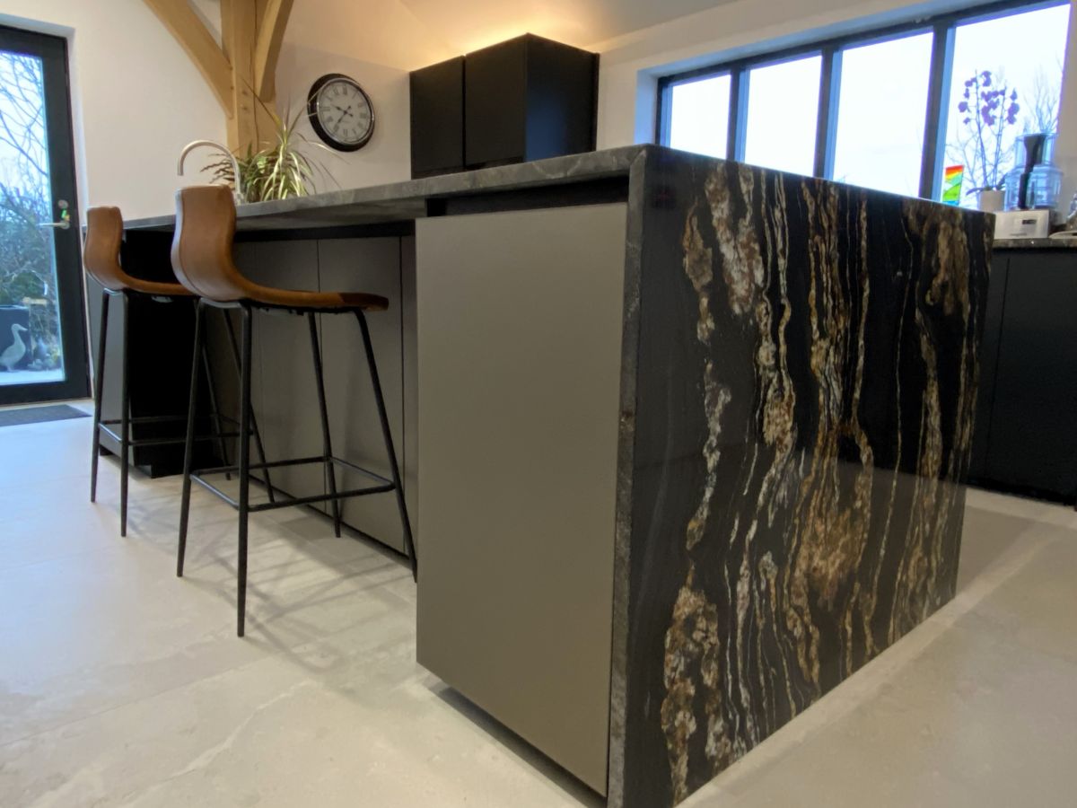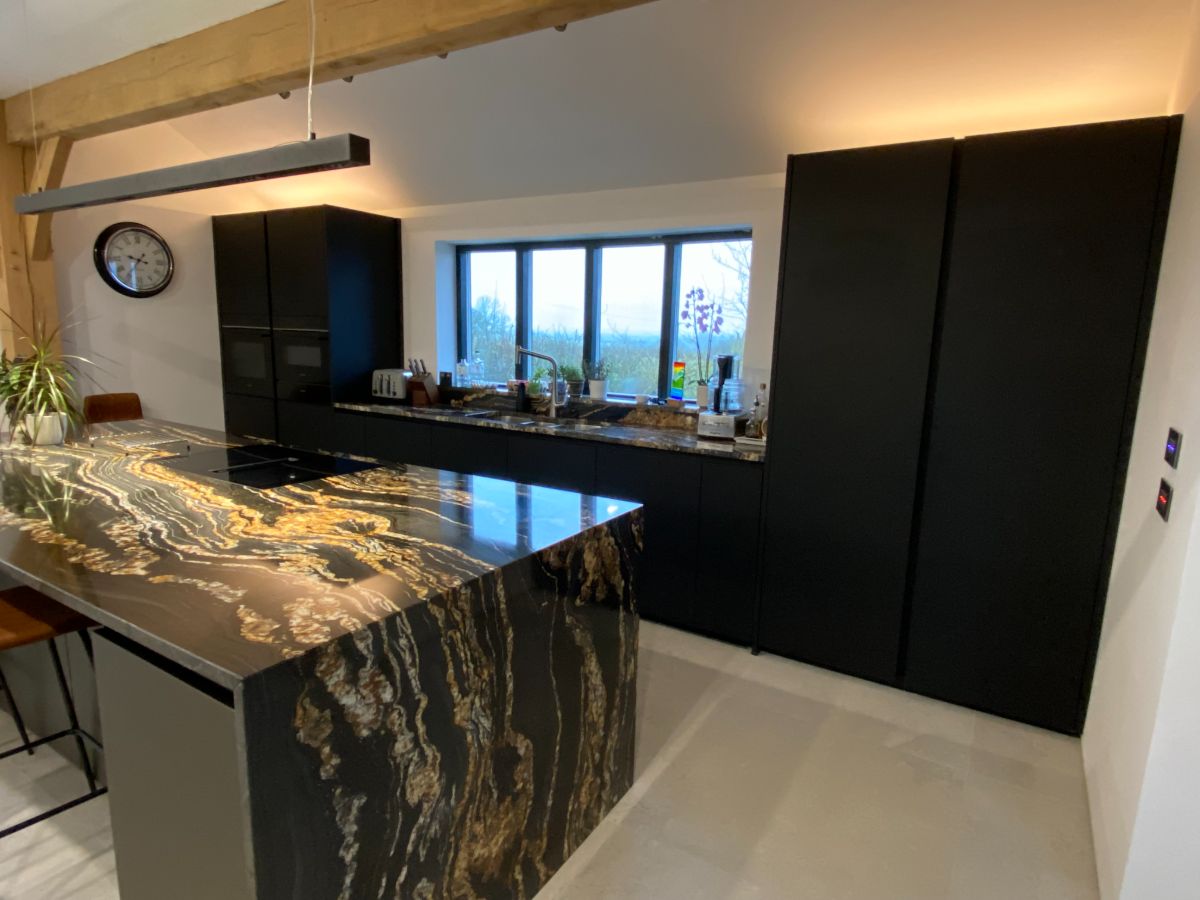 From Next125 this Onyx black matt velvet AFP on the tall units/sink run, the island units are Platinum metallic glass matt, glass doors feature fronts comprised of 4 mm thick toughened safety glass. We have to mention the worktop too which looks fantastic. Thank you so much to our customers David and Jo for sharing the photos.