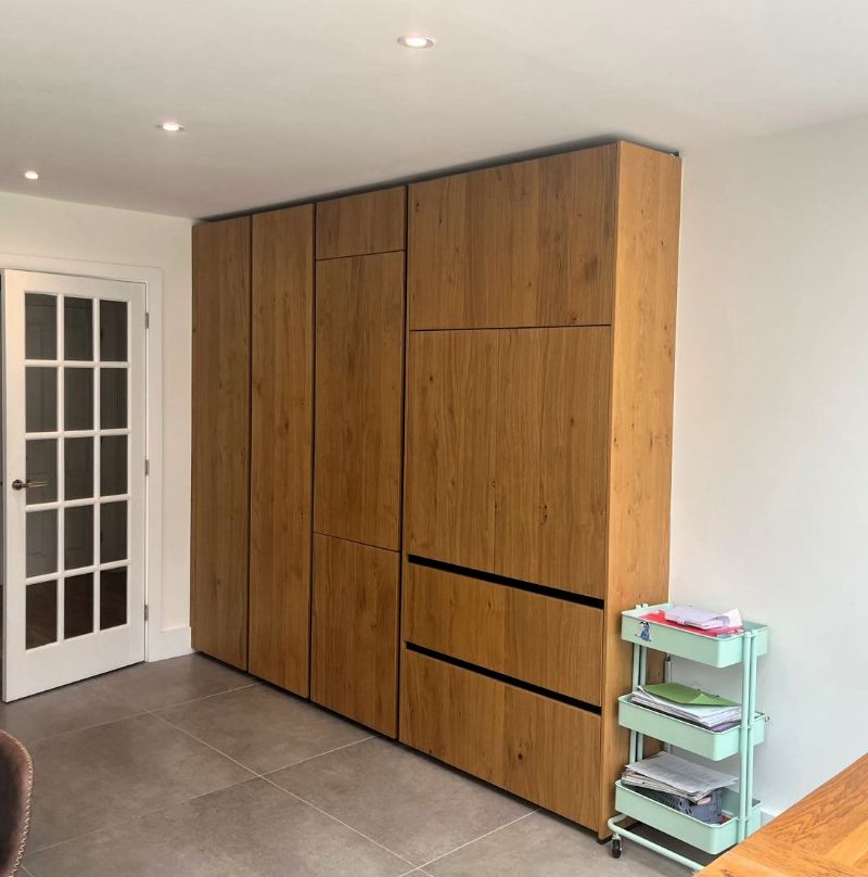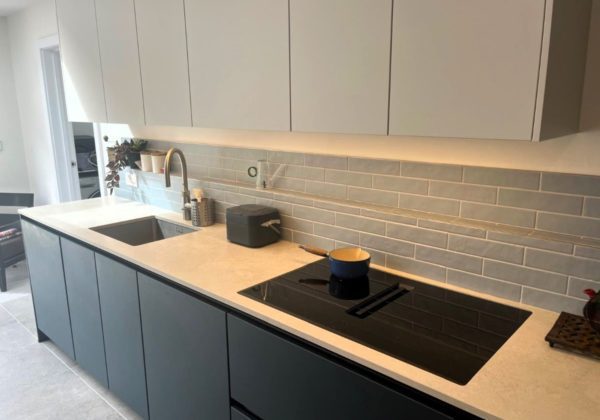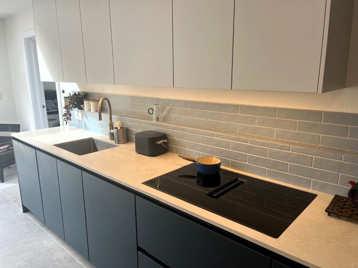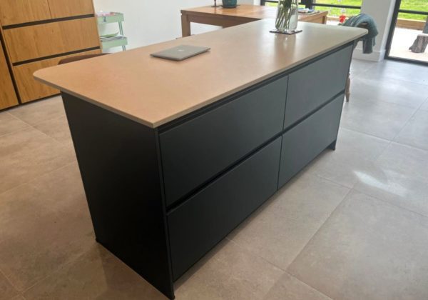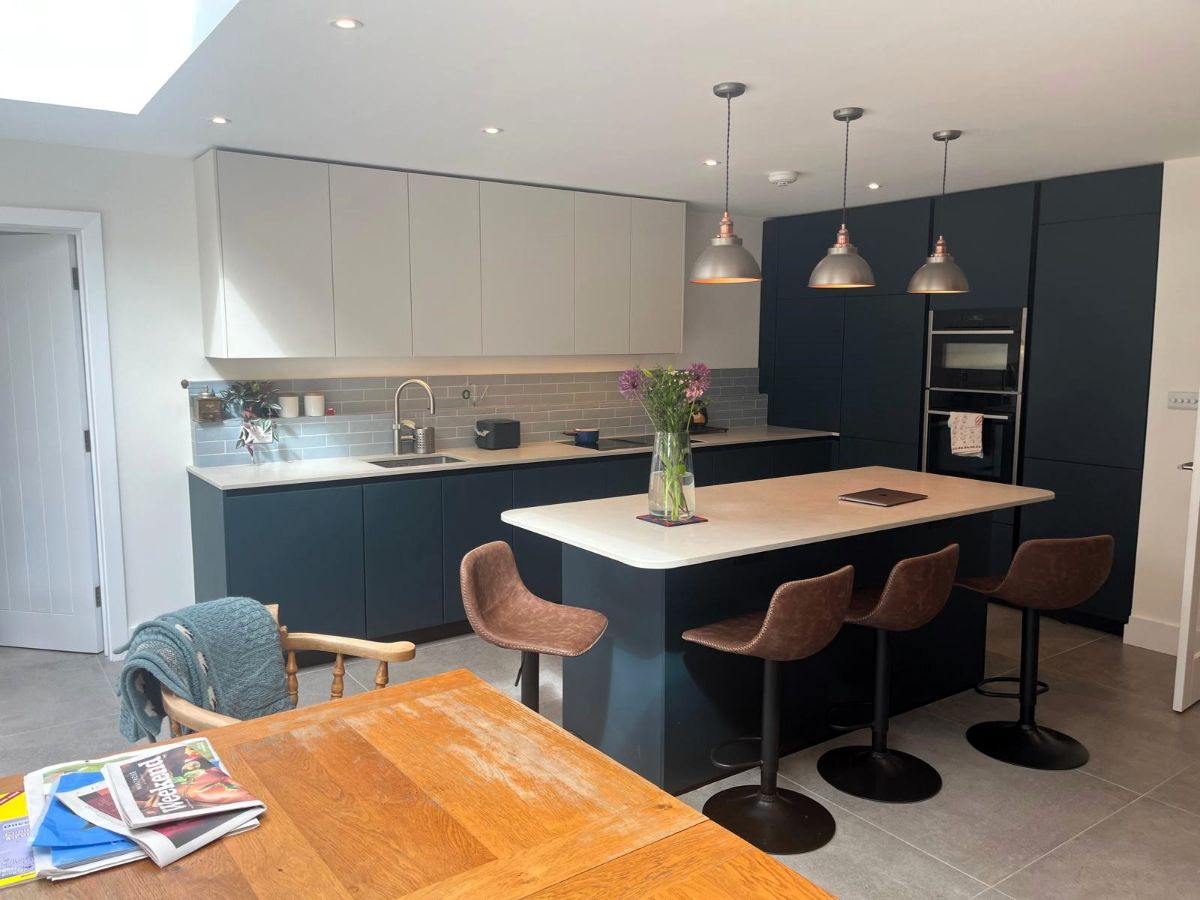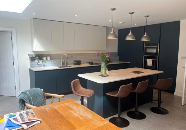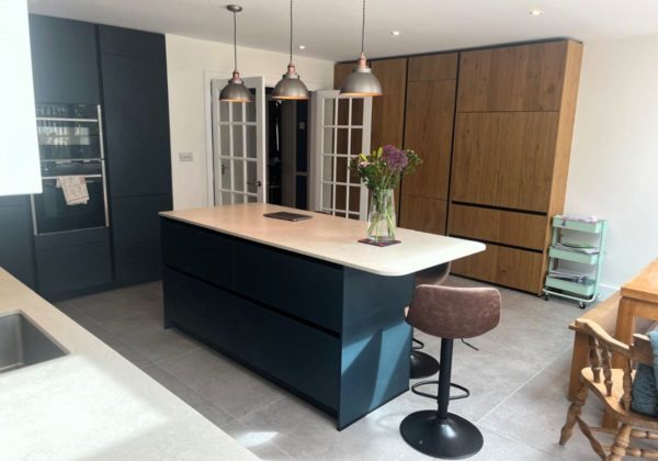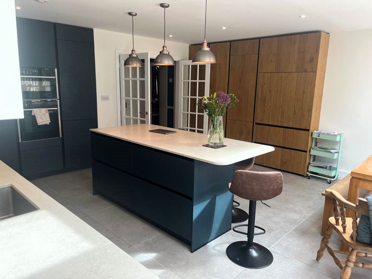 Siena door in Deep blue matt velvet with anti-finger print finish with the unit interiors in Pebble grey, from our Schuller C range. Tall units in Natural knotty oak with the 20 mm thick Quartz worktops on the slimline island and sink run in Concrete earth colour. Thank you very much to our customer Nigel.