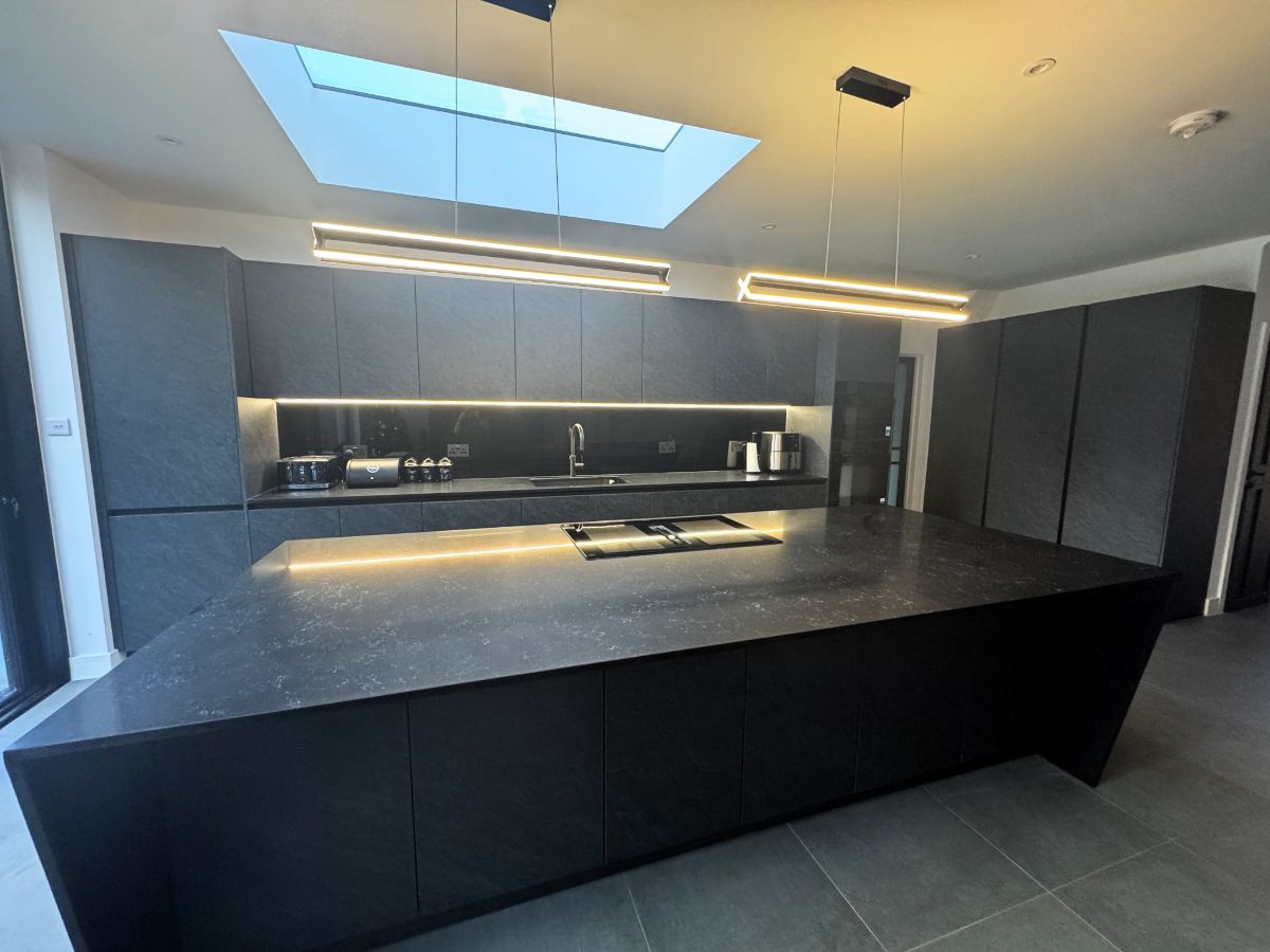 Alvaro slate effect door fronts with matching plinths from Schuller C’s ‘Elba’ range which features 5 contemporary, lightly textured concrete and slate effect doors from off-white to dark slate. This design also has Onyx black handle rails and Lava black carcase’s. Thank you very much to our customer Tony from north London for sharing the photo.