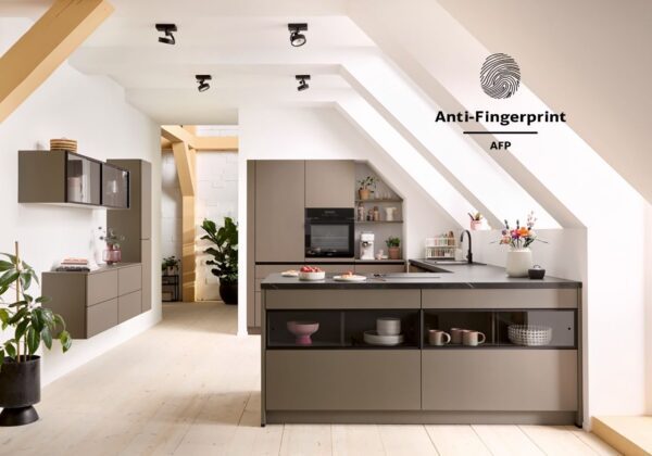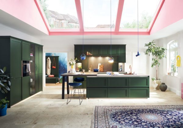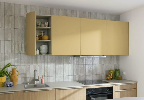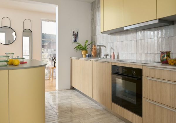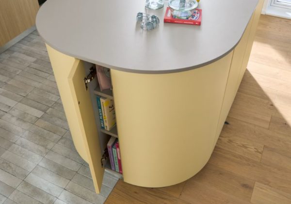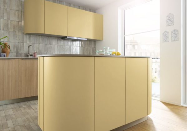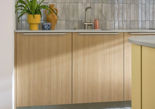 Lineo natural oak effect door with classic style vertical groove, available in the lighter natural oak or dark oak effect. The wall units in sunny pastel yellow with the elegant curved Rondo units in the same.