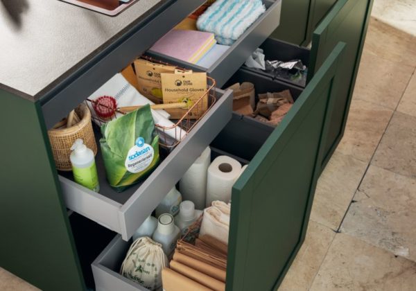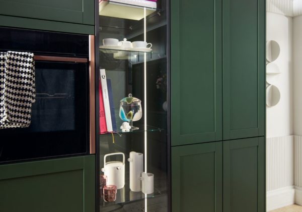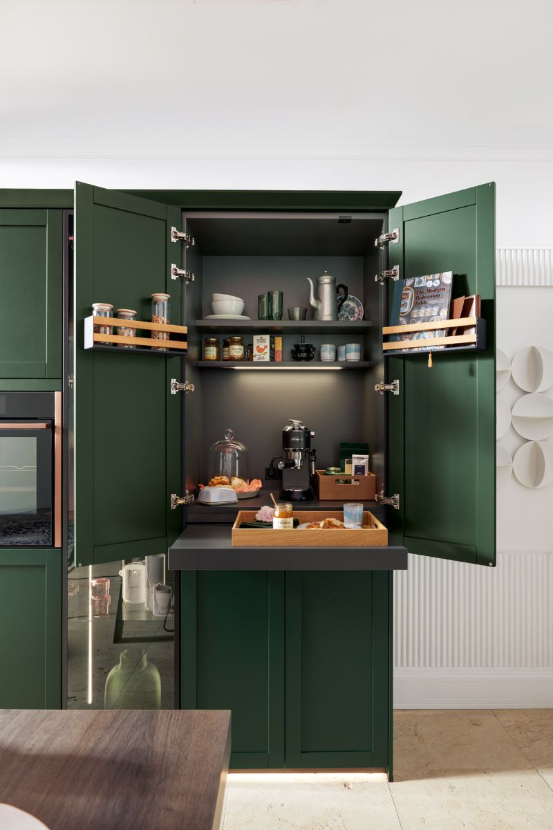 Modern 5-part satin lacquer shaker-style door front, available in 28 colours. Newport combines classic with handle-less modern, kitchen shown here is in Forest green and features a multi-functional top unit, also known as a breakfast unit, its a storage unit but also has everything you need to prepare a quick meal.